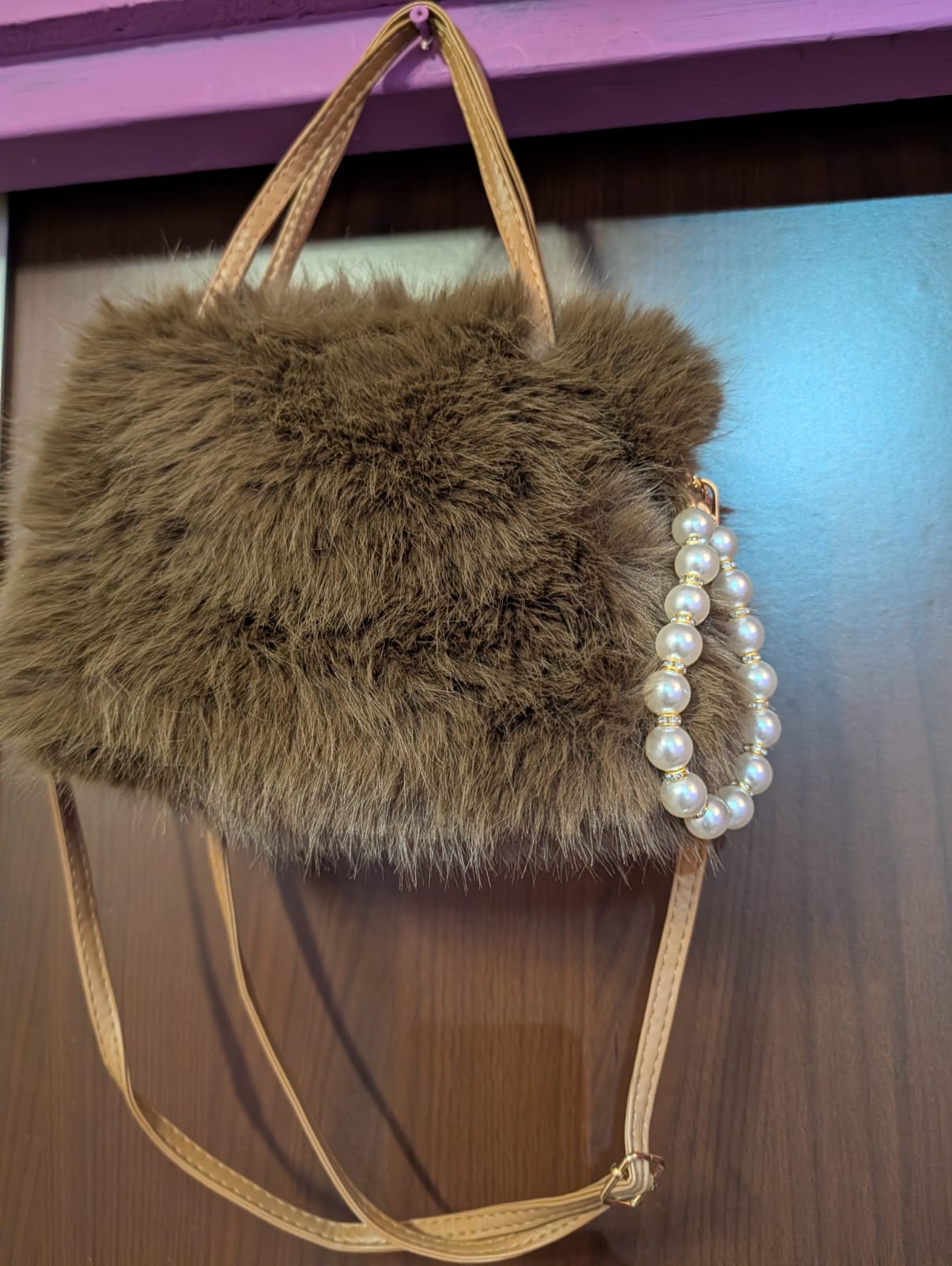 Deze donkerbruine fluffy tas voelt aan als een zachte winterwolk — warm, cosy en heerlijk luxe. De eyecatcher is het handvat van glanzende imitatieparels, dat de tas meteen een chique en speelse uitstraling geeft. Dankzij de verstelbare schouderband draag je ’m gemakkelijk crossbody of over de schouder. Compact, zacht en elegant: de perfecte mix voor herfst en winter outfits.