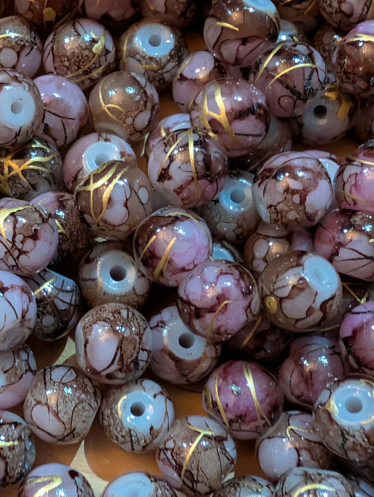 Deze kralen hebben een delicate mix van zacht roze en warm bruin, versierd met fijne goudaders die als kleine barstjes van licht over het oppervlak lopen. De marmerlook maakt elke kraal uniek, alsof ze stuk voor stuk met de hand geverfd zijn. Een subtiel luxe uitstraling, perfect voor elegante én speelse creaties.